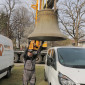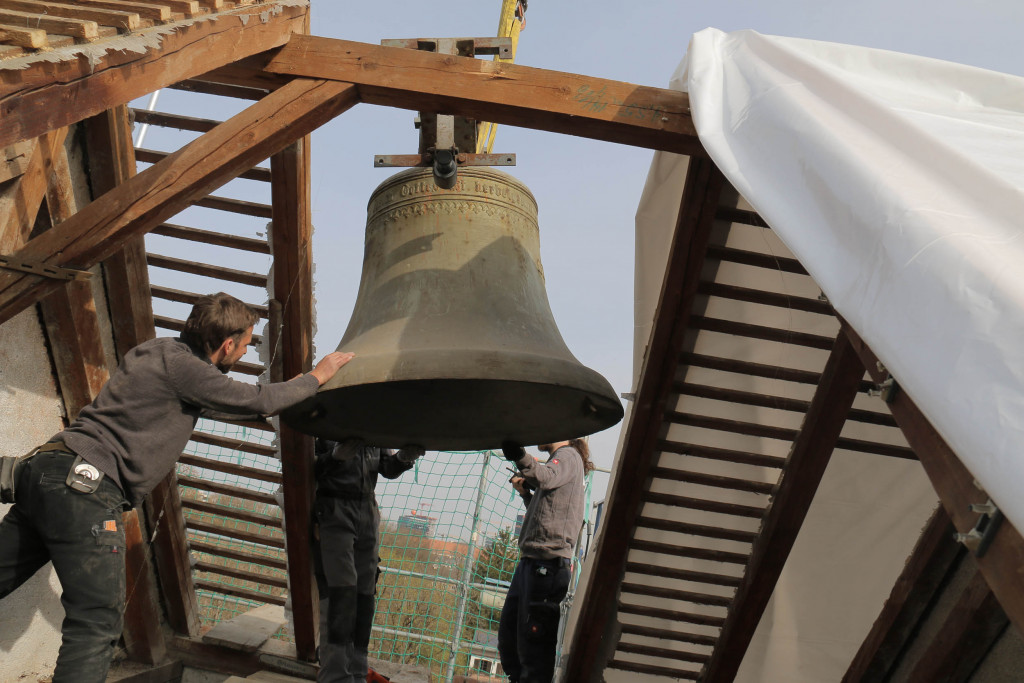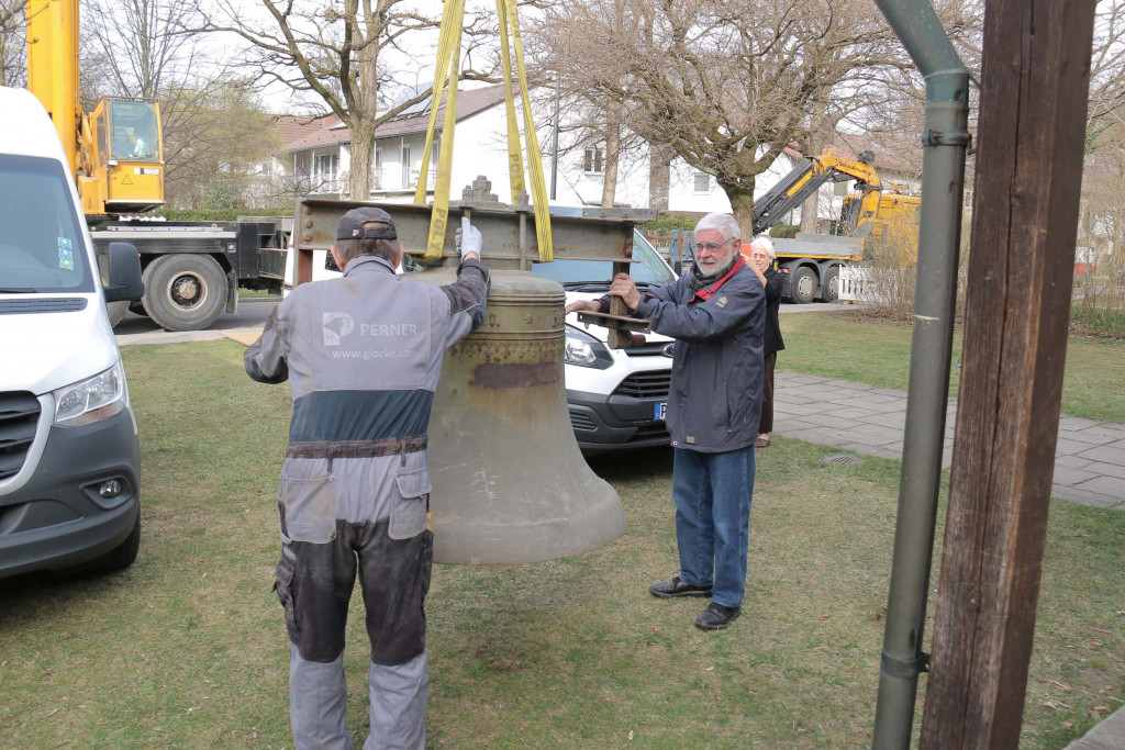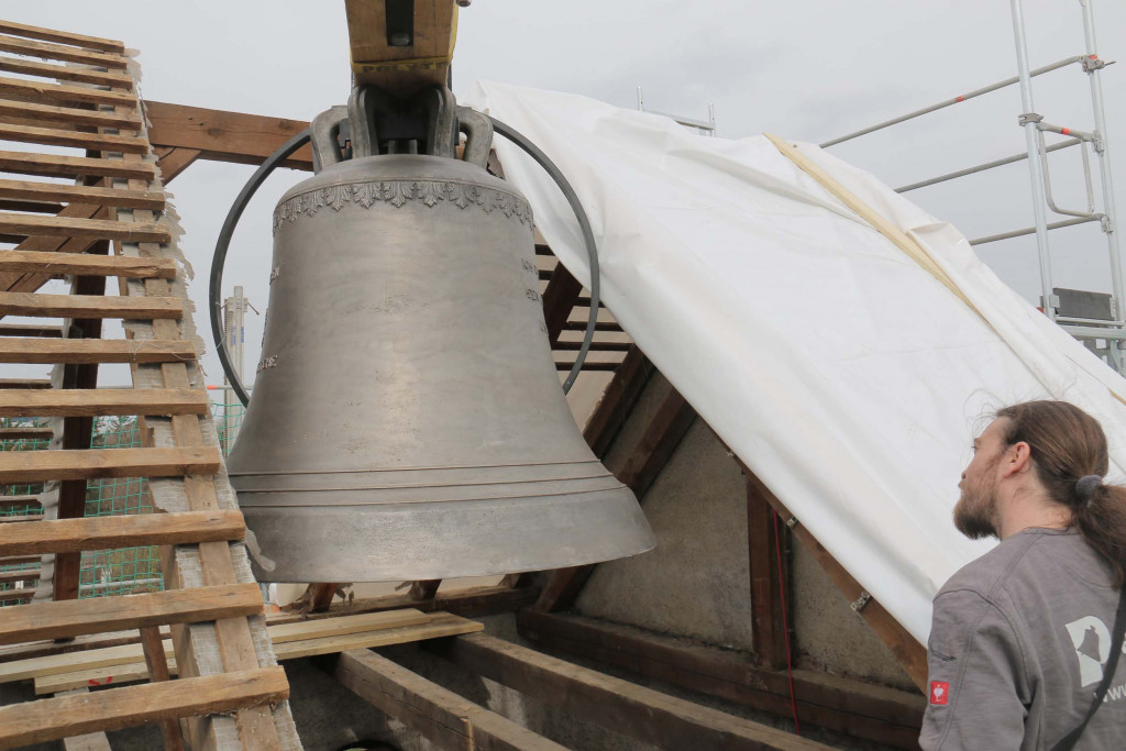Bildrechte Thomas Pesth Am Dienstag, dem 29. März, war es nun soweit. Die alten Glocken wurden hinaus-, und die neuen Glocken hineingehoben, und es wurden zwei Stahlträger zur Unterstützung des Glockenstuhls an der Nordseite des Turm eingeschoben.